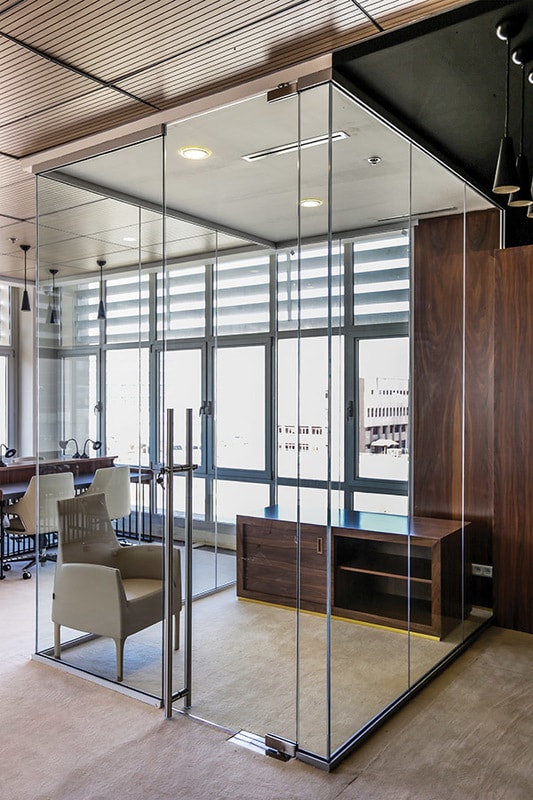 Alüminyum bitiş profilleri, 10 mm temperli camlar, alüminyum kasalı kapı modülü, cam veya ahşap kapı kanadı, 40 mm kalınlıkta laminat veya doğal ahşap kaplamalı dolu modüllerden oluşan glaze tek camlı cam cama ofis bölme duvar sistemi ofislerde maksimum şeffaflığı kullanıcılarına sunuyor. |